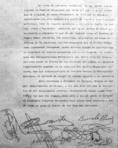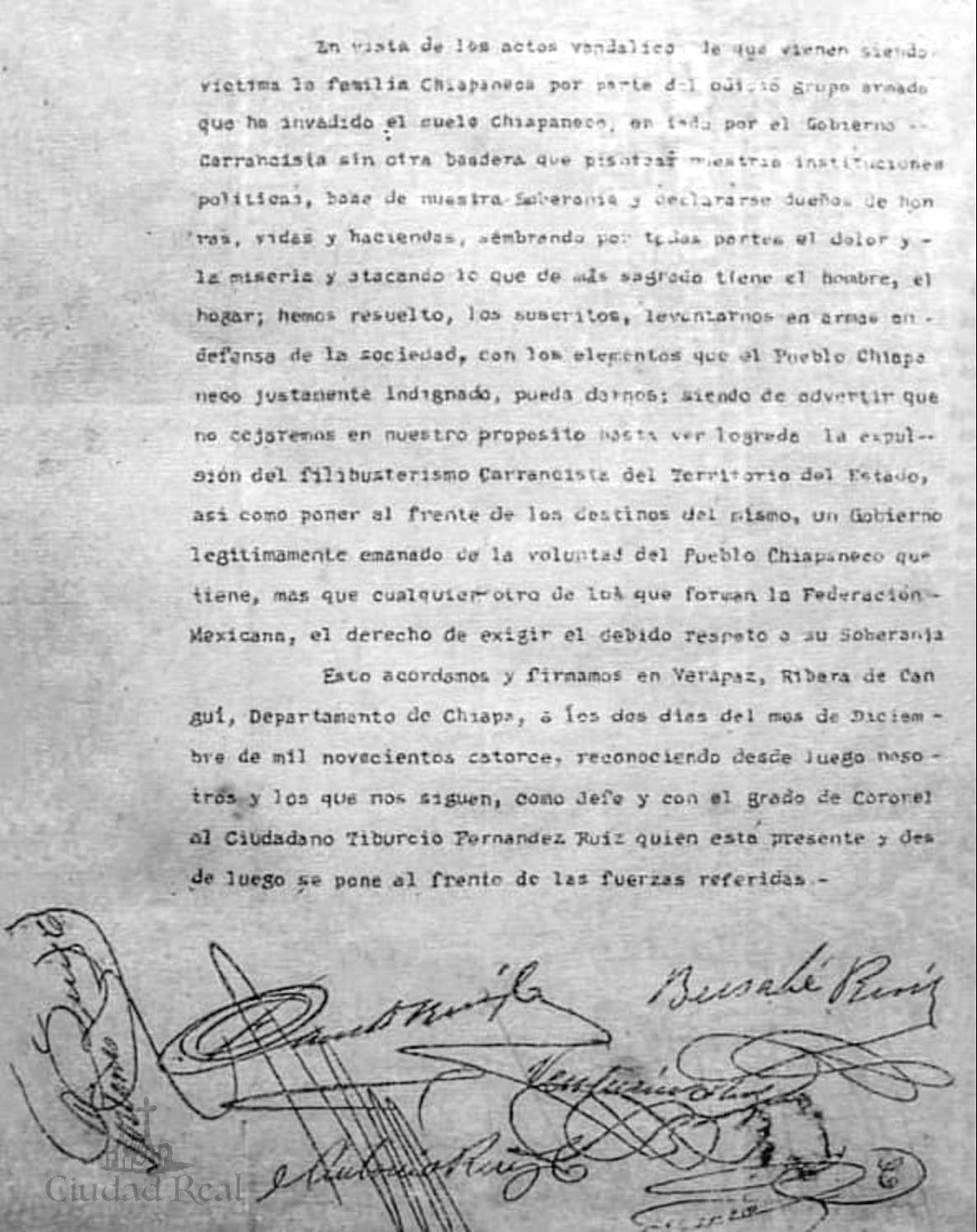 Esto acordamos y firmamos en Verapaz, ribera de Cangui, departamento de Chiapa, a los dos días del mes de diciembre de mil novecientos catorce, reconociendo desde luego, nosotros y los que nos siguen, como jefe y con el grado de coronel al ciudadano Tiburcio Fernández Ruiz quien está presente y desde luego se pone al frente de las fuerzas referidas.