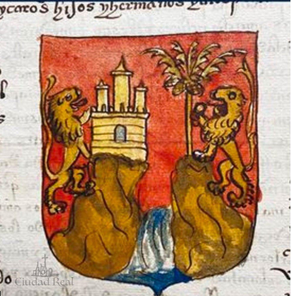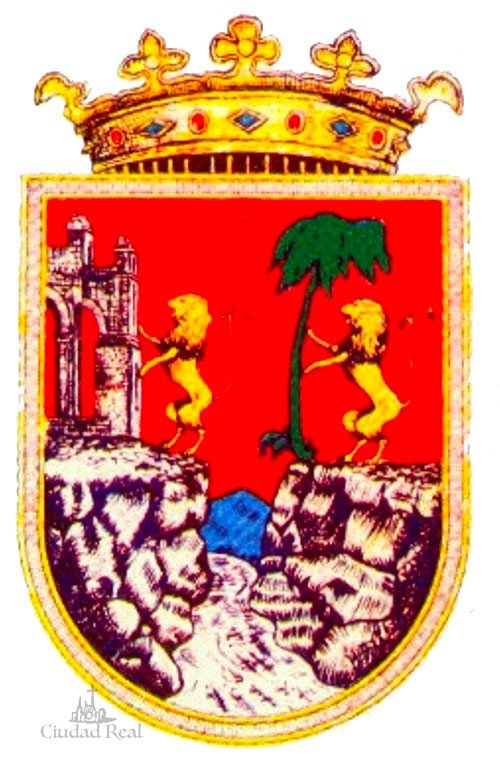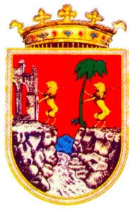 …y tenga por sus armas cognoscidas vn escudo dentro del doss syerras por medio de las quales pase vn riio y encima de vna de las dichas syerras a la mano derecha este vn castillo de oro y vn leon rrampante y arrimado a el y por encima de la otra syerra a la mano yzquierda salga vn palma verde con su fruta con otro leon rampante arrimado asymismo a ella en memoria de la advocacion del glorioso señor san christoual todo ello en campo colorado segund que aqui van figuradas y pintadas la quales dichas armas damos a la dicha villa por sus armas e deuisa señaladas para que las pueda traer e poner e trayga e ponga en sus pendones dellos y escudos e vanderas y en las otras partes e lugares que quisyere e por bien tuuiere segund y como y de la forma e manera que las ponen y traen las otras villas de nuestros Reynos.»*